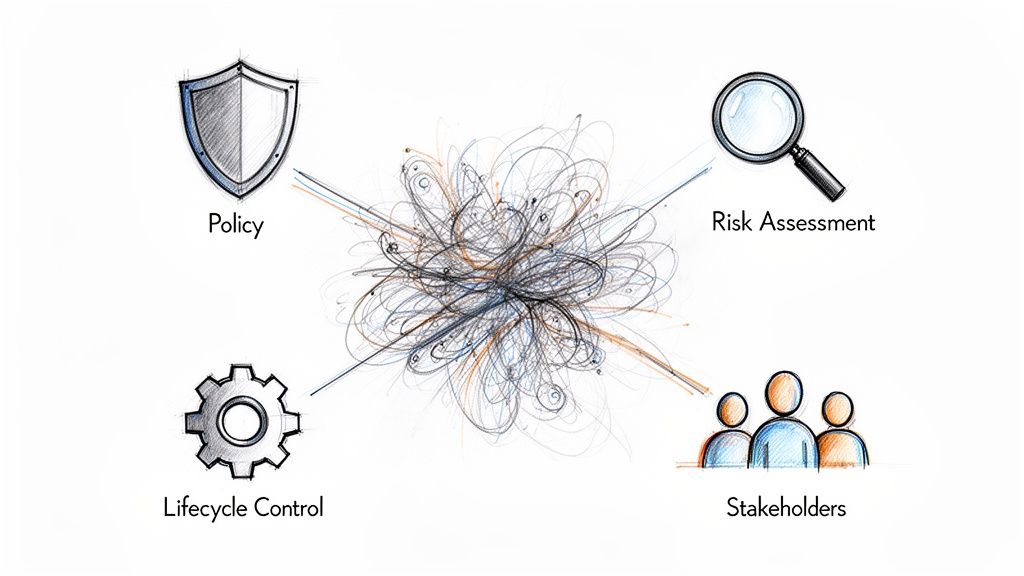A solid AI governance framework isn't just a single policy document; it's a living system built on several interlocking pillars. Each one serves a critical function, and together, they ensure your AI initiatives are effective, responsible, and aligned with your core business values. Without this structure, even the most promising AI projects can stumble into unforeseen risks.
